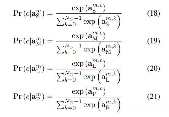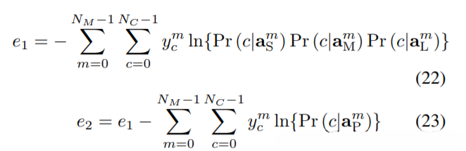 其中y m c和NM分别为第m个样本的ground-truth label和训练样本总数。在训练过程中,在最小化两个目标函数的基础上进行模型优化。在测试阶段,则对Pr (c|a m)、公关(c |米米)和公关(c |米l)这三个线性激活值取平均值以获得集成输出v1;随后利用4个线性激活值(包括v2年代, 公关(c |米 米 ), 公关(c | 米 l ) 和 Pr (c|a m))进行进一步的计算以获得最终结果。