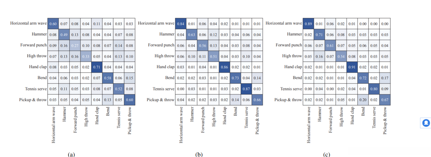 图6: MSR Action3D数据集AS1在测试集上应用TS-LSTM v1模型后,在动作类别上的Softmax平均概率分布情况如图所示。(a) Softmax0对应的结果。(b) Softmax1对应的结果。(c) Softmax2对应的结果。每个混淆矩阵中的每一行与每一列分别对应 ground truth 和 prediction 的结果。