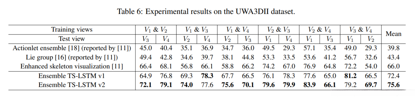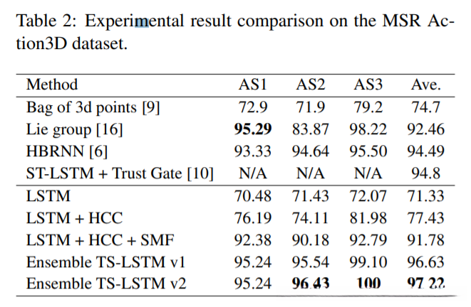 MSR Action3D数据集:我们依据[9]所述的标准协议开展研究工作。按照该协议的要求,在具体实施过程中将数据集划分为三个动作类别:动作类别1(AS1)、动作类别2(AS2)以及动作类别3(AS3)。其中AS1由受试者编号为奇数(1, 3, 5, 7, 9)的数据构成,在AS2中包含偶数编号(2, 4, 6, 8, 10)的数据样本用于验证过程。参考表中的实验结果表明,在本研究中我们提出了一种集成TS-LSTM模型(版本v1和v2),其平均精度分别达到了96.63%和97.22%,并将其与现有方法进行了对比分析
