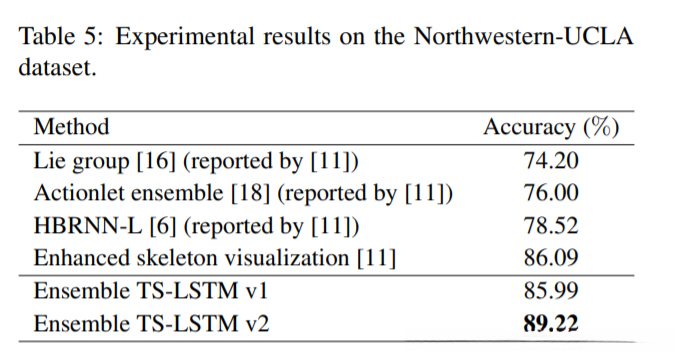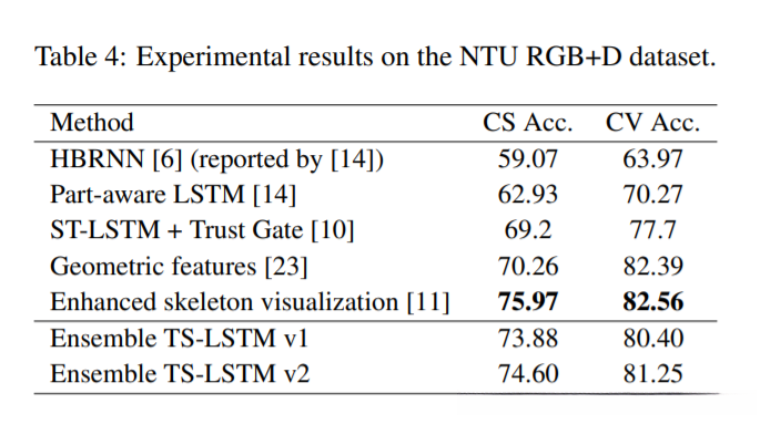 我们通过在五種不同的架構上進行實驗展示了我們提出技術的效果。具體來說:第一個模型采用了基於骨架的动作識別的LSTM 作為基線架构;第二個 model引入了人类认知坐標的概念並将其應用於第一個 model 中;第三個 method則利用了顯著運動特徵这一关键特性並将其整合到 second model 中;第四個 method采用了cost為(22) 的TS-LSTM v1集成;最后一個 model則采用了組合式的TSLSTM v2結構