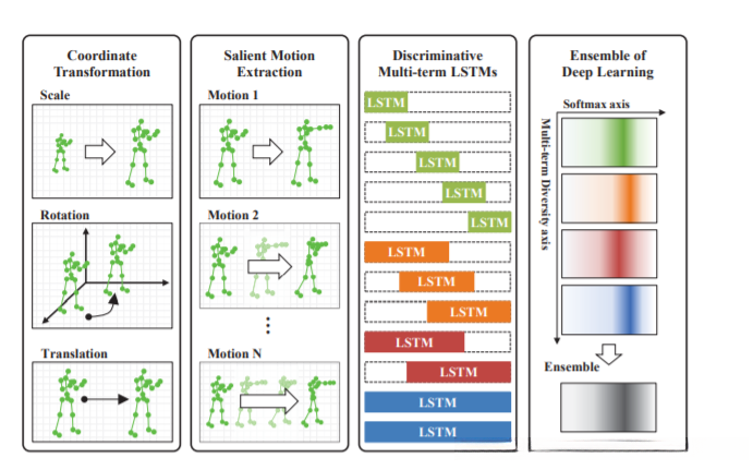 首先通过GramSchmidt过程将人体骨骼转换为人类认知坐标系统 从而提取出人体的姿态特征和运动特征 并成功捕捉到不同时空维度下的动态信息 在此基础上开发了一种新的MAS运用方案 综合考虑不同时间步长长度的LSTM模型 并在此框架下完成训练与测试过程 实验结果表明 在五个不同的数据集上展现出超越现有最新动作识别技术的优势 作为未来研究方向之一的是解决数据集中可能出现的问题案例 另一个重点方向是优化拟议的TS-LSTM集成网络参数 以便更好地捕获各种时空动态 最后我们还计划将多种数据增强技术应用于所提出的模型中 进一步提升其泛化能力