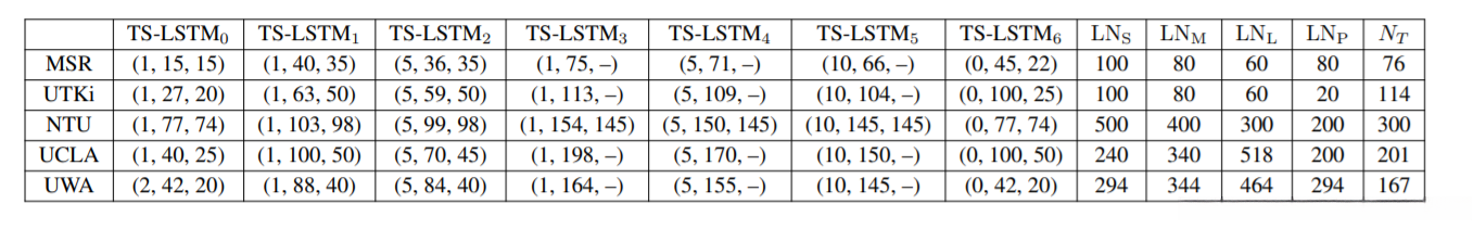 本表为本文所提出的模型的参数设置。其中 TS-LSTM_l 是该模型中的第 l 个 TS-LSTM 部件,在其具体参数配置中包含了 (D_l, S_l) 两个基本要素部分。其中 LN 表示 TS-LSTM 各组成部分拼接后的隐藏单元数量;具体而言,在 TS-LSTM 结构中: