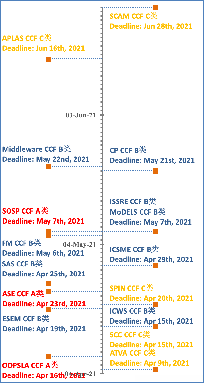 以上为未来三个月已公布截稿日期的CCF推荐,软件工程领域会议,按照时间排序。 个别会议因为没有公布截稿信息而不在所列时间线内。