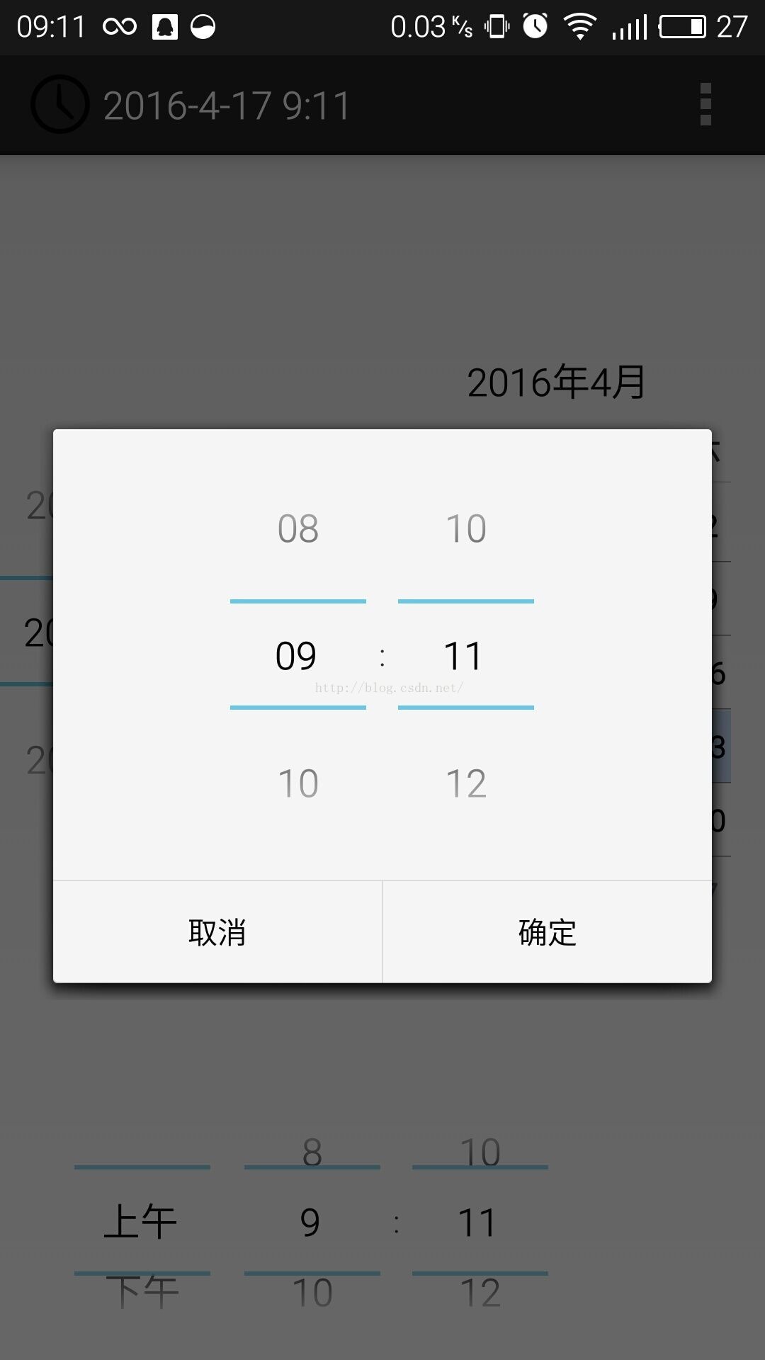 运行程序后会发现对话框后边的标题栏上显示了当前的日期和时间,在第一个时间对话框更改时间后显示日期对话框时,更改过的时间又显示到了标题栏上,当在日期对话框更改日期后,标题栏也显示出更改后的日期,进入页面滑动控件进行选择日期或者时间,都会显示在标题栏上。