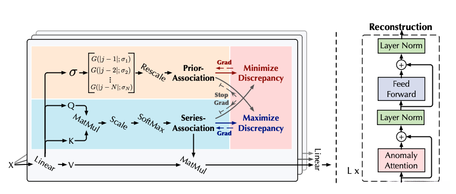 基于transformer架构展开研究,在提出Prior-association与Series- association的基础上,并对关联不一致度进行计算分析,并将其作为衡量异常行为的重要指标。