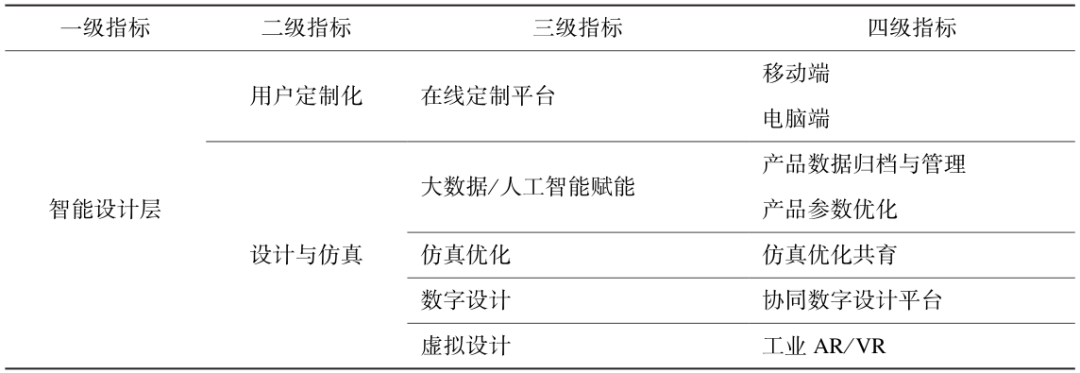 智能设计主要通过从手工经验转向数据库参数优化与机器学习模型化来实现对工业产品结构进行系统性创新,在智能制造领域具有基础性的技术支撑。具体而言,在这一创新过程中分为离散型和流程型两大类:其中离散型智能设计涉及产品结构与工艺流程的设计优化;而流程型智能设计则仅限于工艺流程的设计体系构建。在这一层次的设计体系中(如图所示),其评价指标体系由二级到四级形成了较为完善的层级结构(见表3)。其中二级指标侧重点在于工厂运营中的个性化定制能力、信息化水平以及智能化改造效果的综合考量。