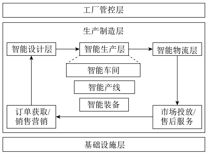 鉴于企业对供应链的不同环节有不同的需求,在具体实施过程中侧重点各有不同[9]。每个行业都有其特定的制造流程模式,在这些模式中既有共性特征也有个性特征[10]。因此企业应着重于构建技术竞争优势以及提升经济效益这一核心目标,并根据自身实际情况建立智能化 manufacturing设施[11]。为了使企业在开展智能化改造过程中能够迅速转化为最大生产力本文提出了一种新的模型框架该框架以著名业务流程管理学者August-Wilhelm Scheer提出的工厂体系架构框架[12]为基础进行构建并将其划分为基础设施层生产制造层及工厂管控层三个层级结构进行详细规划