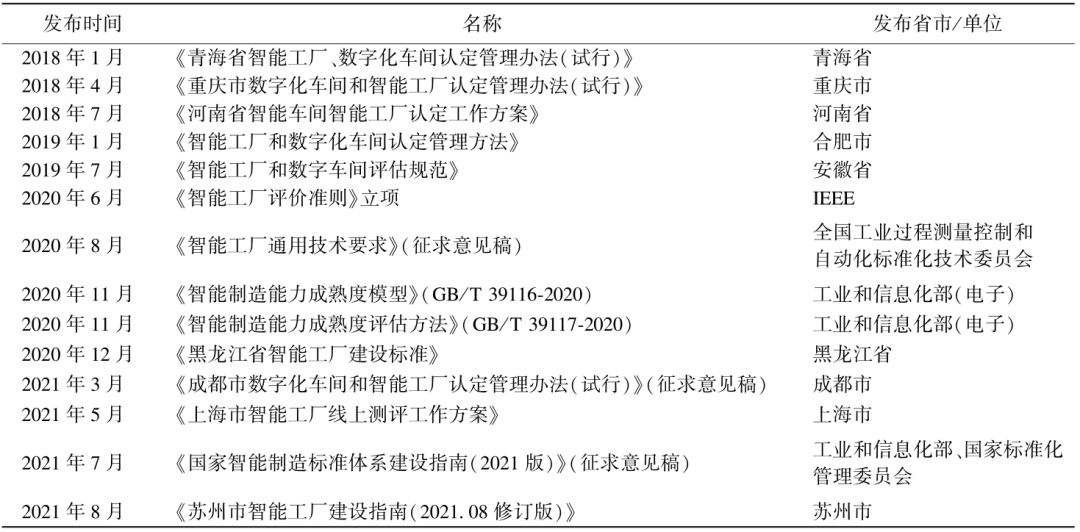 我国 strategically respond to national strategic initiatives, actively advancing the integration of digital information technology and modern manufacturing. By promoting industrial upgrades, various provincial and local governments and units have issued evaluation standards for the maturity of intelligent manufacturing (see Table 1).