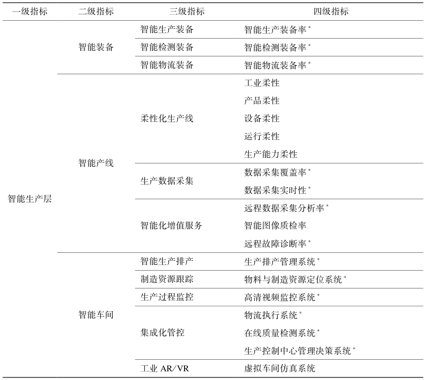 在生产系统中,单机智能设备被视为制造业发展的关键支撑设施,在这一过程中不同类型和功能的智能设备实现互联互通从而构建起智能化的生产线不同类型的这些生产线进一步整合则形成了智能化的车间而这些车间又通过互联连接形成智能化的工厂(如文献[14]所示)。在这一层级中系统性地采集并分析制造过程中的各项数据信息随后借助数据驱动技术手段实现了生产设备优化配置合理分配生产任务以及对生产流程进行精细化管控最终以智慧化的方式实现科学有效的生产决策评价体系。该评价体系包含3个二级指标体系11项三级指标要素以及20项四级指标构成要素(如表4所示)。其中从工厂智能化程度柔性化水平和服务信息化程度三个方面分别对工厂进行综合性能评估