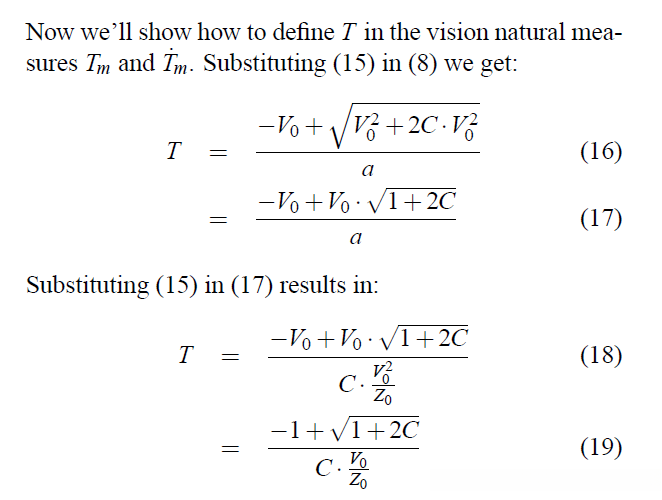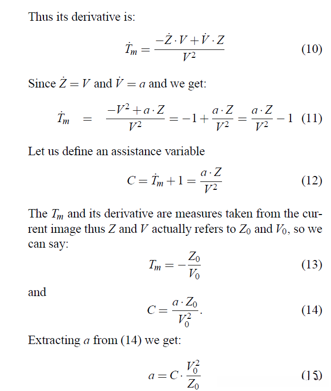 如果可以求出T,那就可以得到TTC了。又因为对于图像来说,以上的速度和加速度都不是可以直观观察到的。但是由情况一可知,在恒定速度模型下的