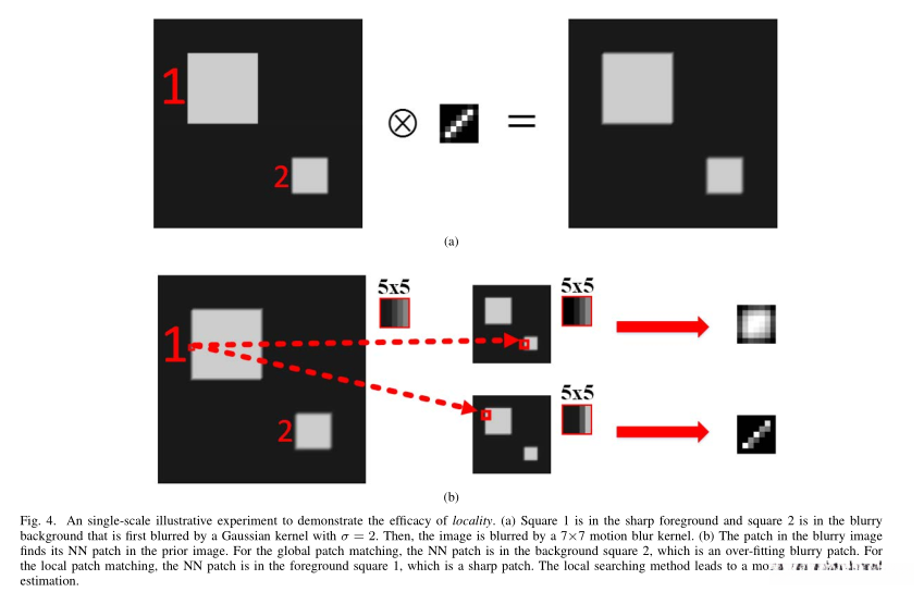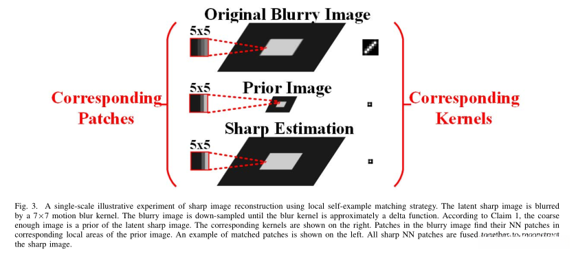 图4详细说明了在单尺度上使用局部自示例匹配策略进行锐化图像重建的过程。其中,模糊图像的样本及其如何通过匹配先验图像中的块来重建锐利图像的细节被清晰描述。