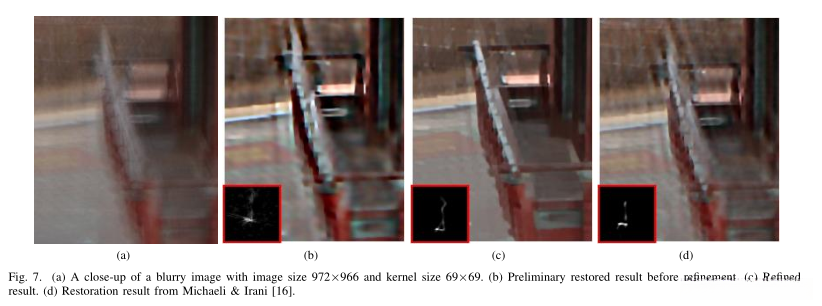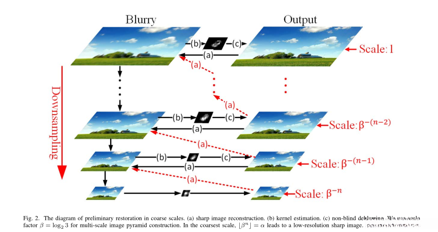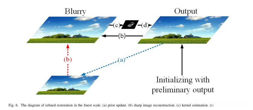 * 展示了使用估计的核在最精细尺度上进行非盲去模糊的步骤。