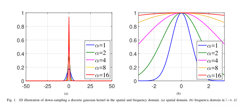 - 图1a 展示了在空间域中对离散高斯核进行下采样的效果。可以看到,随着下采样因子的增加,高斯核的宽度减小,变得更像是一个狄拉克δ函数。