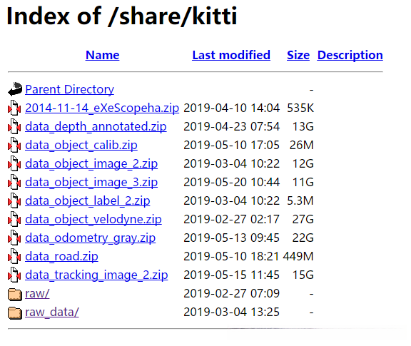 下载地址:有位网友将其放置在自己的服务器上,方便大家下载。该链接表示赞赏:http://dataset.f3322.net:666/share/kitti/