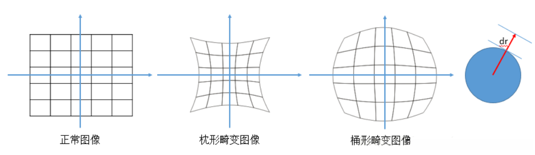 径向畸变:中心点的畸变程度最低,随着半径的增大,畸变程度也随之增强,具体表现为枕形畸变和桶形畸变两种类型。