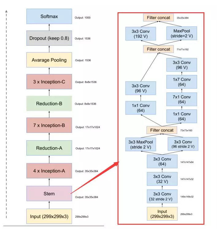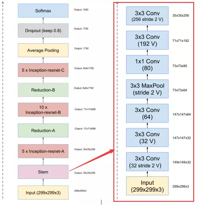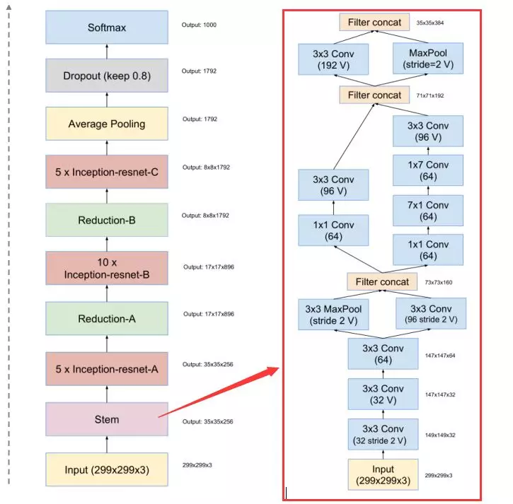 Inception-Resnet v2的整体架构与v1保持一致,在茎的具体结构上存在差异;在茎的部分中使用的是相同的模块设计;如图所示。
