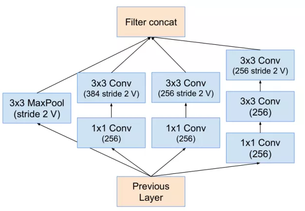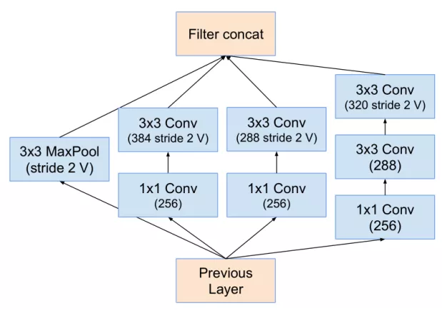 经过尺寸缩减至17×17后再降为8×8时,并非仅依赖于简单的池化层而采用了一个双阶段的降维机制
