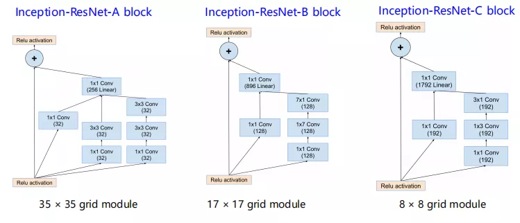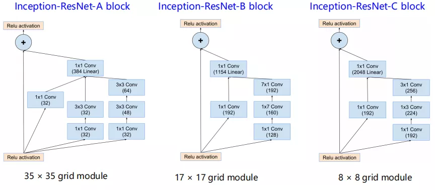 Inception v2中有以下三种不同的Inception 模块,如下图