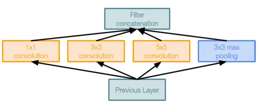 对前一层的输入实施分层卷积操作,并通过采用不同尺寸的感受野来实现(其中包含1×1、3×3和5×5尺寸的感受野)。