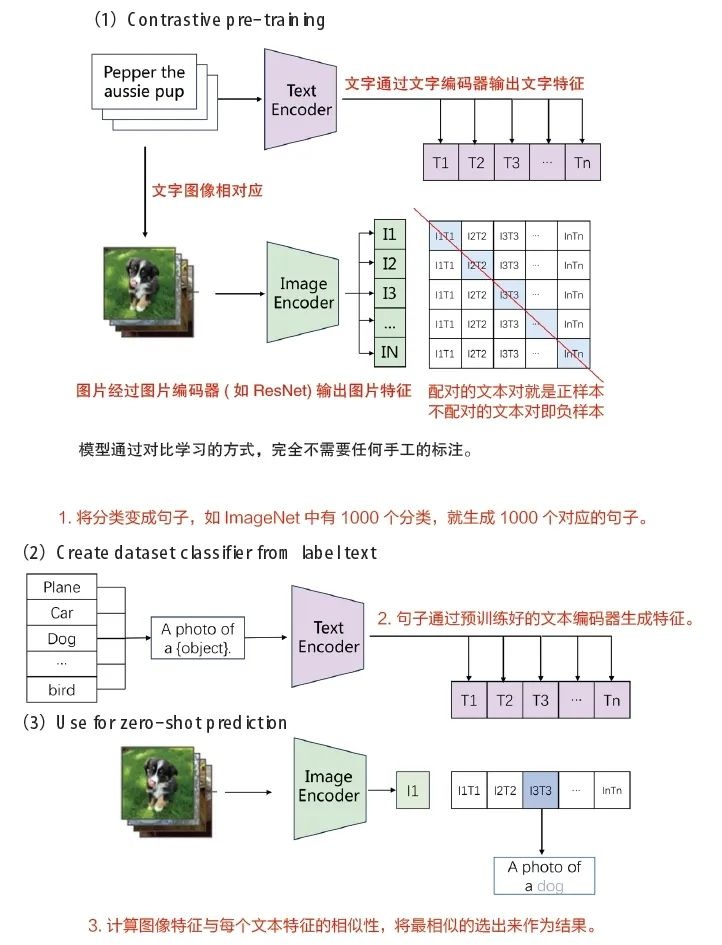 多模态预训练神经网络模型(CLIP)是一种基于对比学习框架的算法设计,在其核心组成部分中整合了图像编码器与文本编码器两个独立模块。该模型具备强大的零样本(Zero-shot)学习能力,在多个下游任务场景下展现出卓越的表现力。通过同时接收批次处理图像数据与自然语言文本信息输入编码器系统进行特征提取,并借助维度映射技术将不同空间特征转换至统一维度表示空间内,在余弦相似度评估机制下实现各特征间的相似性度量计算。