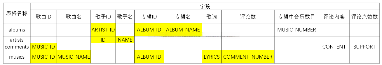 基本思想:根据musics表格取出music_id,music_name,album_id,lyrics,comment_num,从albums表格中根据album_id找到album_name和artist_id,从artist表格中根据artist_id找到artist_name。这样前面的8个就得到了,最后一个hot_num代表的是热门度,此热门度的初始值是comment_num,后续根据用户点击情况调整。