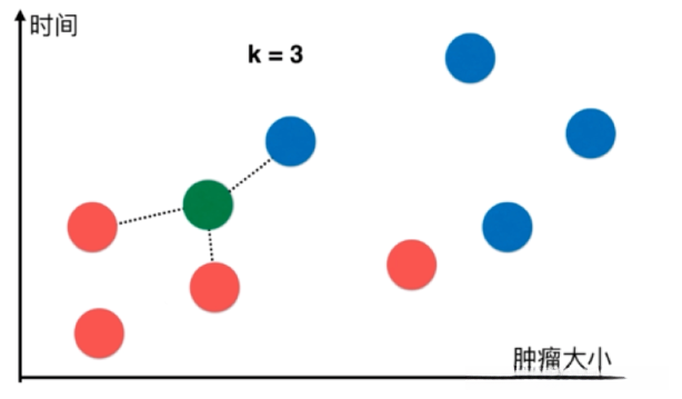 最近的三个点都是蓝色的,所以该病人对应的应该也是蓝色,即恶性肿瘤。