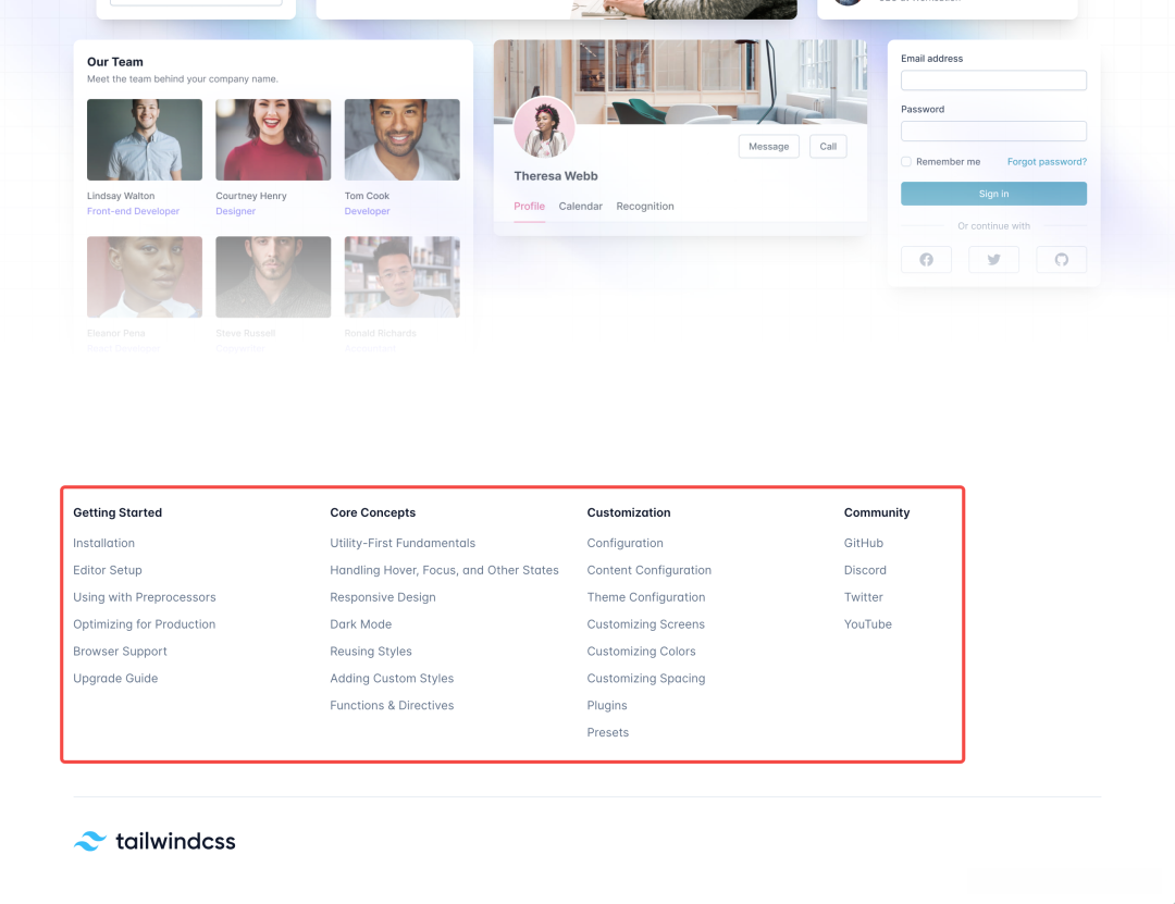 如我们大多数网站底部的多列导航栏设计,以 Tailwind 官网为例: