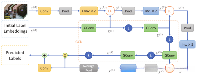 其次, 我们采用整体标签系统嵌入以更加有效地表示学习. 在各层次中分别引入GCN与CNN的横向连接结构以整合标签系统编码, 在特征学习阶段辅助识别类别信息.