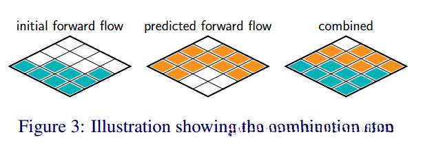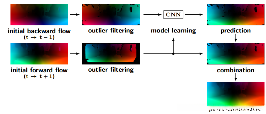 在第一步中, 我们需要获取前向和后向的初始光流信息, 即在t时刻及其前后各一个时间单位(t+1和t-1)内的光流信息. 基于这一前提, 在处理大位移光流方面存在现有通用技术. 在其中, 匹配过程使用coarse-to-fine PatchMatch算法进行精确对齐, 然后采用鲁棒插值技术(RIC)完成图像修补(inpainting). 最终优化阶段则采用顺序适应性光照补偿细化(OIR)方法. 值得注意的是, 只有异常值去除这一环节仍沿用传统方法(即双向一致性验证机制).