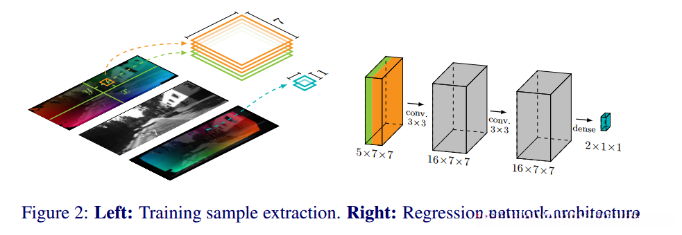 该研究采用基于CNN的回归方法来估计前向光流场。具体而言,在每一段训练过程中,我们需要利用上一节所述的连续排列的7×7像素块集合作为输入数据来估计每个像素块中心点处的空间位置相关的模型( location dependent model )。这种设计具有重要意义,在独立运动物体、非刚性形变以及透视投影变换等复杂场景下都表现突出。为了衡量预测结果与真实值之间的差异程度,在损失函数方面我们采用了最小化预测光流矢量与实际正向光流矢量之间绝对差值的方法:As loss function we minimize the absolute difference between the predicted flow vector and the actual forward flow vector.