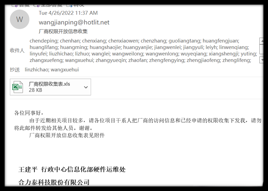 如图6-5所示,在这种情况下收到了一封邮件。此外还有另外两名同事也受到了同样的影响。他们主动向目标发送Excel文件以进行攻击操作。尽管进行了多方面的尝试但这种钓鱼邮件虽经多方面尝试仍未能成功被发现。