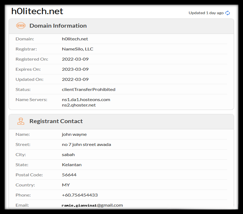 b. 关于h0lite**.net, 首先通过whois查询工具进行信息检索, 查出该域名确实在漂亮国由NameSilo, LLC进行注册使用(如图2-1所示), 然后对A记录以及MX记录进行详细分析后发现, 此钓鱼邮件系统的邮箱服务器同样位于漂亮国某一地区的一台服务器上(如图1-4所示).