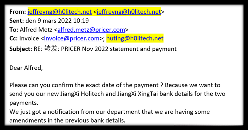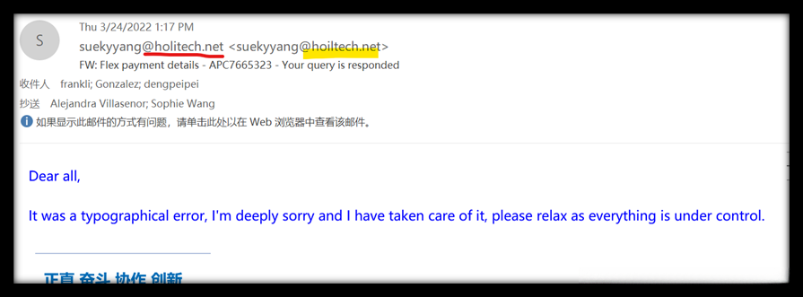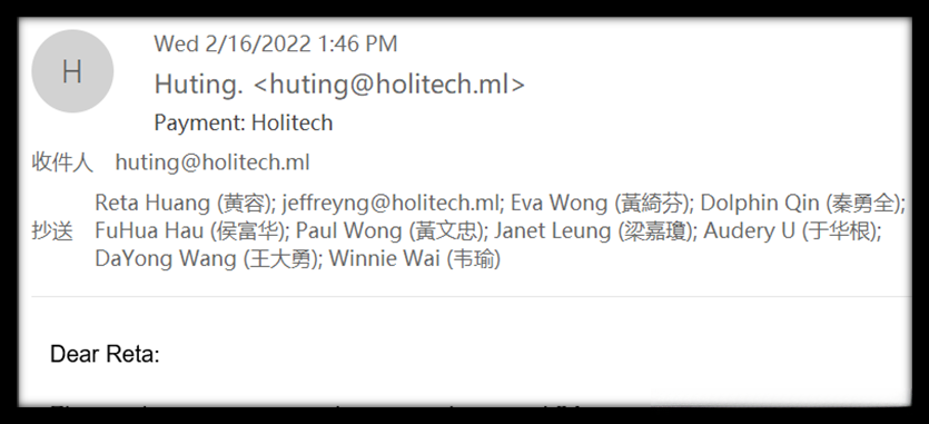 自2022年3月以来,某分子公司被调查发现其运用公司邮箱系统。不法分子制作并伪造虚假邮件后缀标识符模仿公司邮箱发送给客户及供应商以非法手段获取敏感信息。其中涉及的冒充邮箱标识符包括h0lite**.net、holite**.ml以及hoilte**.net等三个变体。
