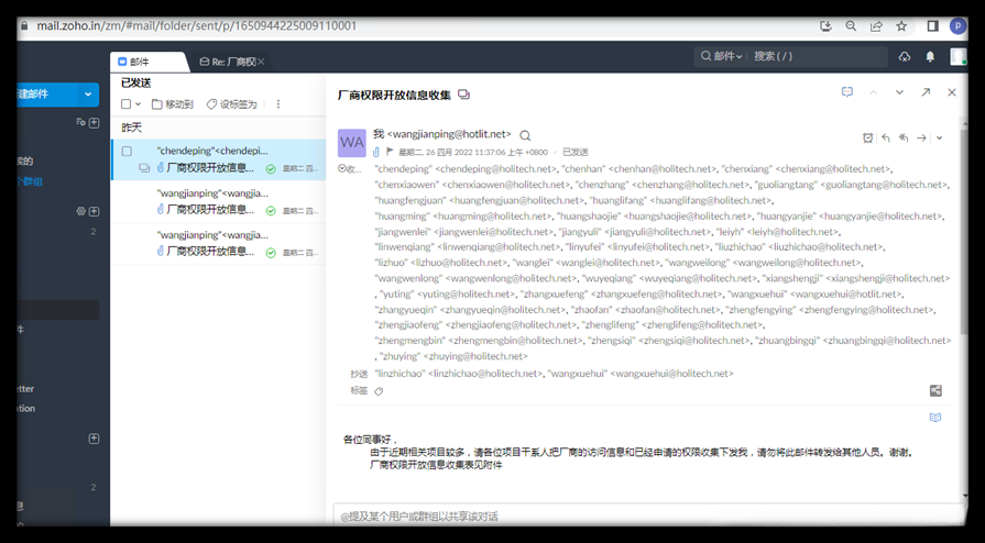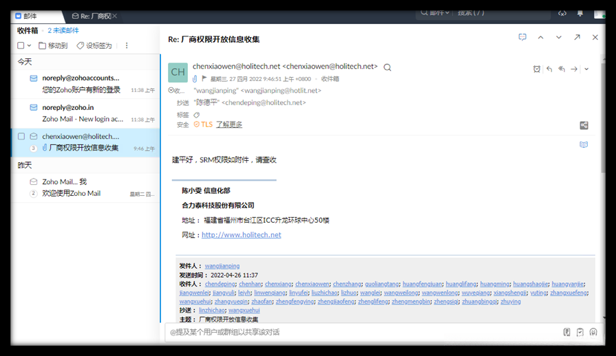 外部邮件:非holite**.net结尾的合法电子通信工具;这种形式主要用于开展与公司内外部事务相关的业务交流活动。