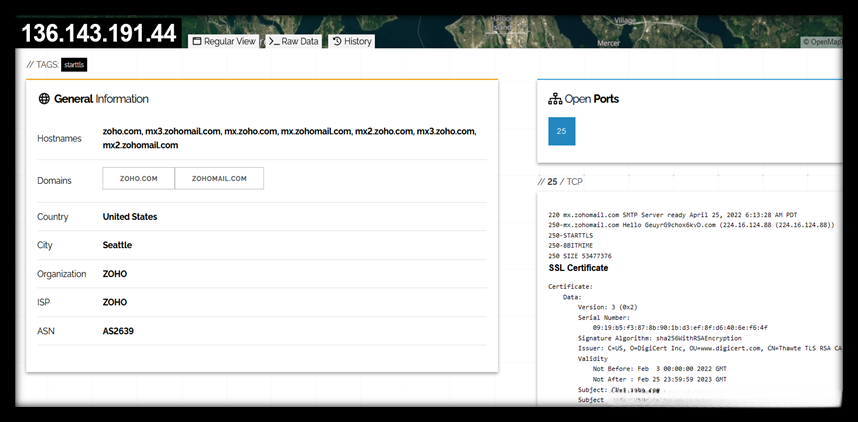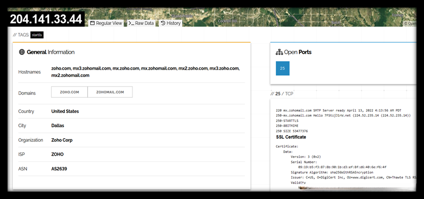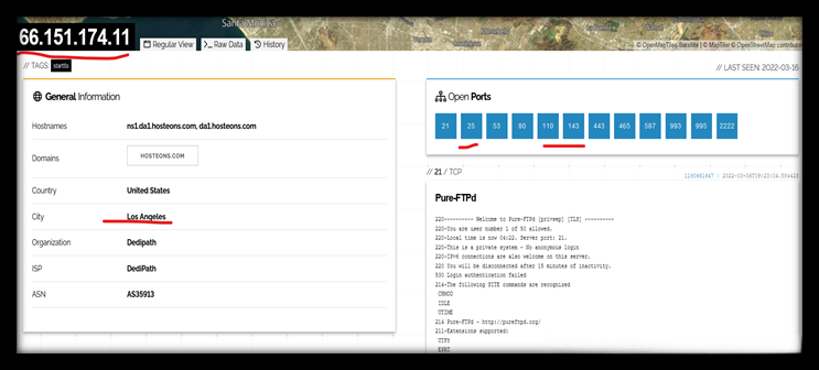 关于hoilte.net,在漂亮国由注册商DYNADOT, LLC进行了注册(图3-1)。随后对MX域进行了解析,并成功对应于三条MX记录:mx\mx2\mx3(图3-2)。进一步分析发现,在各自的情况下分别解出了两个IP地址:136.143.191.44和204.141.191.44(图3-3至图3-7)。通过Shodan调查发现这两台IP地址分别服务于位于漂亮国的两台主机(图3-6至图3-7)。