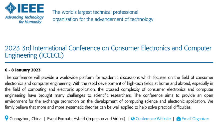 进入21世纪以来,计算机技术的高速发展带来了消费电子产品的快速更迭。在技术迅速发展历程中,众多高校与企业研发了许多相关技术和产品,取得了丰硕学术和应用成果。2023第三届消费电子与计算机工程国际学术会议将于2023年1月06-08日在中国广州召开。此前,2022第二届消费电子与计算机工程国际学术会议已于2022年1月14-16日在中国广州召开。2021第一届消费电子与计算机工程国际学术会议于2021年1月15-17日在线上已成功举办。会议论文集于会前完成见刊,会后1.5个月完成检索。本次会议主要围绕消费电子发展、网络信息安全、人工智能、物联网等研究领域展开讨论。大会将就目前的热点问题展开研讨,共享研究成果,推动相关研究与应用的发展与进步,推进学科的发展和促进人才培养。我们诚挚欢迎相关领域中的相关各个专家学者踊跃参会。