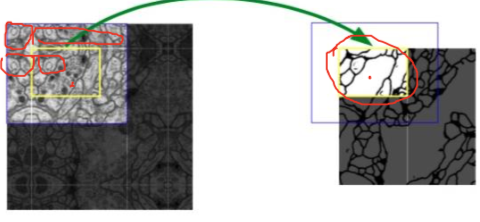 其中,蓝色框是输入,黄色框是输出。注意看左图中,对黄框的边界一圈是做了镜像的padding。同时这个模型也说明了,做图像分割,输入和输出是可以不一样大的。