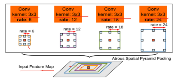 ASPP(Atrous spatial pyramid pooling ):解决多尺度问题,这种带空洞的金字塔池化思路非常有用,如上图所示,对于同一个输入的 feature map ,采用了四种3×3的卷积核进行特征提取,但是这四种卷积核的感受野是不同的,这就完成了对同一 feature map 的多尺度特征提取。
