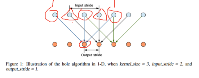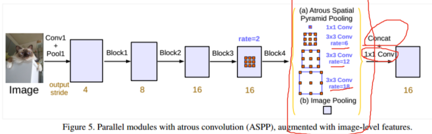 孔洞卷积的串行:下面的图片的下半部分是孔洞卷积的串行示意图(画圈圈的那里),上半部分是传统的卷积,可以看出空洞卷积保持了输出的分辨率。