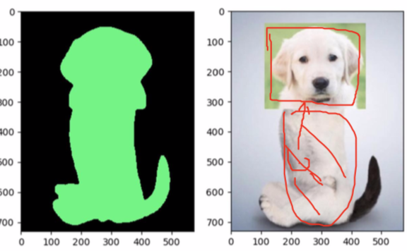 图像分割思考:如下图所示,我们将狗的头与猫的身体进行拼接,然后就行分割,可以看到模型将整体视为一只狗,从中可以发现,模型在进行分割时,头部起到了主要作用,所以不仅仅是考虑了对于每个像素的分类,同时考虑了图像的整体信息。