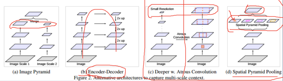 下面是四种方法,第一个是图像金字塔;第二个是Unet;第三个是DeepLabV1的空洞卷积,第四个是DeepLabV2的金字塔池化。DeepLabV3就是针对第三个和第四个进行的优化。
