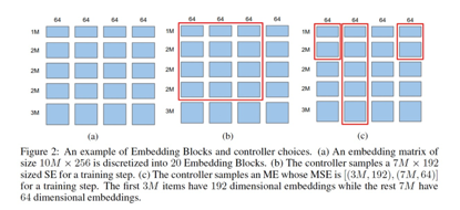 在推荐系统中(Recall/Rank指标)的应用场景下,输入特征通过嵌入层生成了大量可训练的参数。然而,在不同特性和同一特性的不同取值之间(由于它们覆盖的数据集存在差异),这些参数获得训练的机会也有所区别。对于高频特性和高频率取值,则建议采用较高的嵌入维度以更好地捕捉信息表达;而单一嵌入维度则难以充分展现模型对数据处理的能力