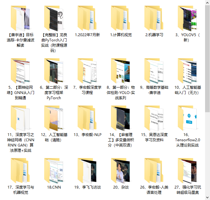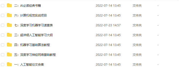 免费分享一些我整理的人工智能学习资料 给大家,整理了很久,非常全面。包括一些人工智能基础入门视频+AI常用框架实战视频、图像识别、OpenCV、NLP、YOLO、机器学习、pytorch、计算机视觉、深度学习与神经网络等视频、课件源码、国内外知名精华资源、AI热门论文等。
