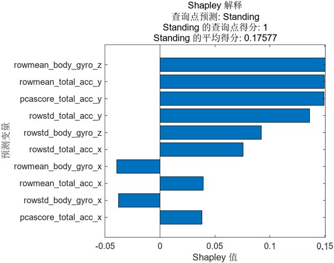 图中显示了排行前十的特征及对应的 Shapley 值,我们可以看到 rowmean_body_gyro_z 的值最大,说明它对错误判别的影响最大,当然紧随其后的几个特征的 Shapley 值也较为接近。