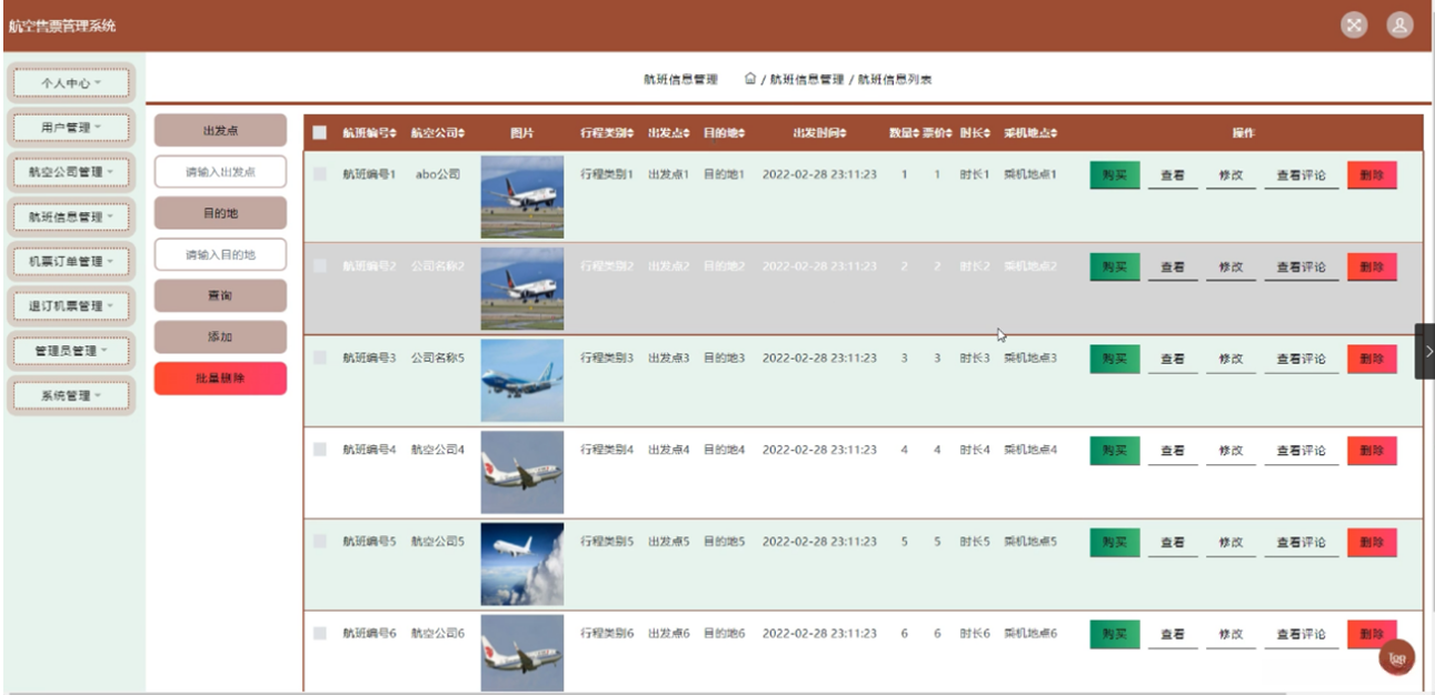 该航班信息管理页面支持对航班编号、航空公司、图片资料以及相关参数等内容进行购买、查询、更新和互动反馈等功能。其中包含详细的商品数量及商品价格信息,并提供时长计算服务以帮助您规划行程安排。具体操作包括商品下单购买、订单浏览与查询功能以及订单详情查看与商品评价等功能。