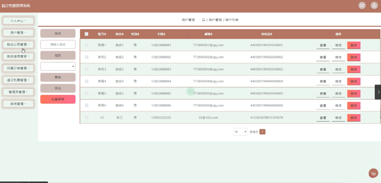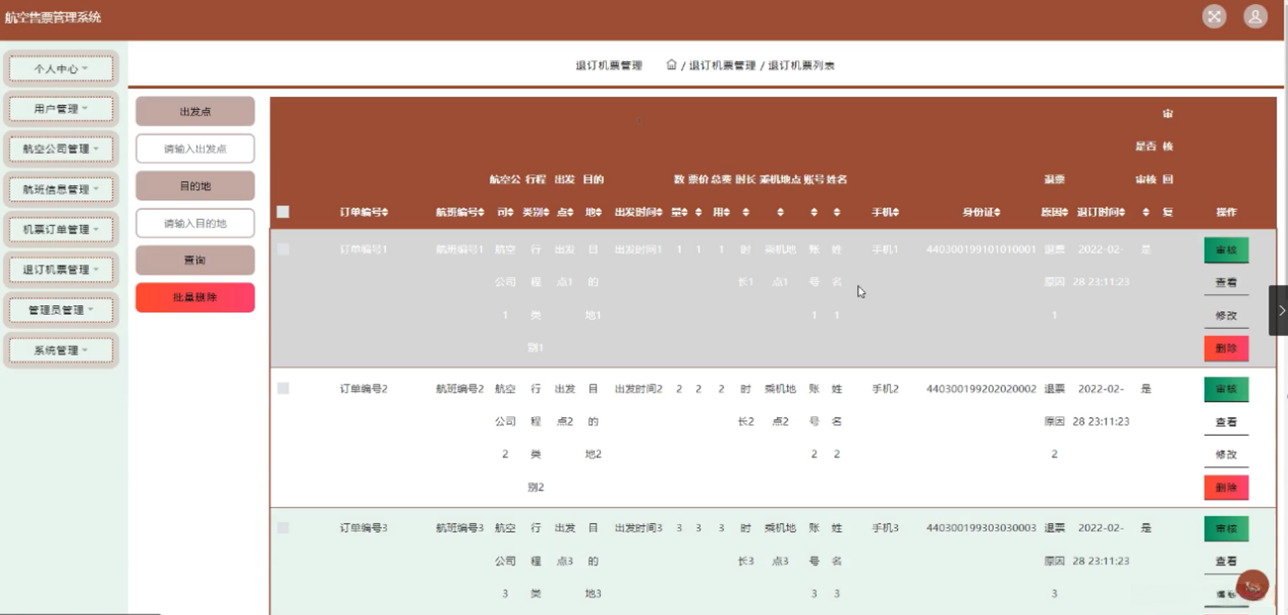 在登录系统之后(图5-5所示),管理员可进入个人中心并处理用户的各项信息(如航空公司、航班及机票相关数据)。同时可通过该模块完成退订机票等操作(如图5-5所示)。