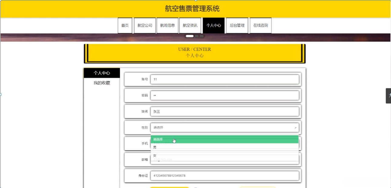 在个人中心页面中填写账号、登录码、名字、性别信息、手机号码、电子邮箱以及身份证号码等信息以更新个人信息资料,并可根据个人需求对我的收藏内容进行较为详细的设置。如图5-3所示。