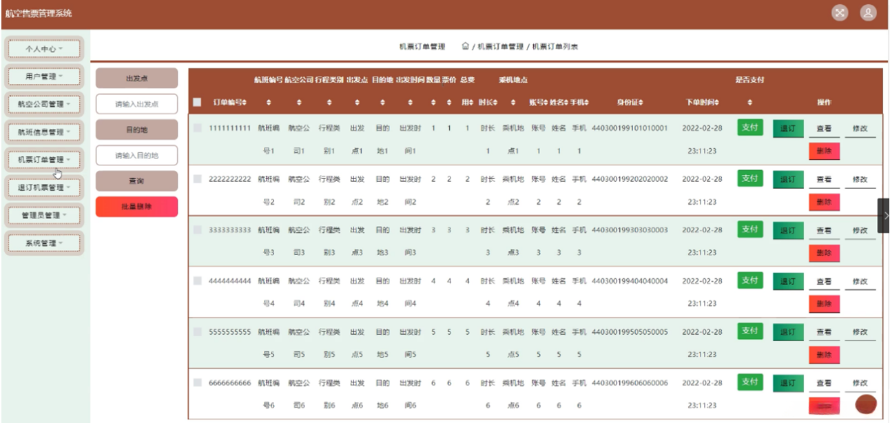 在此 flights orders management platform上支持完成 orders payment、取消、查看、修改以及删除相关信息。