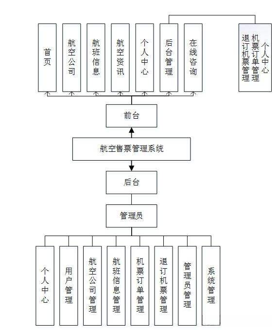 为更好地梳理本系统整体思路, 对该系统采用结构图形式进行呈现, 并具体实现该航空售票系统的功能结构图