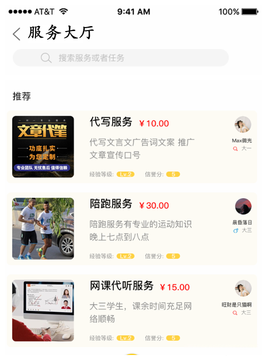 5.服务大厅:对于勤工俭学的同学来说,这个版块可以让有闲暇时间的同学在此发布技能获取佣金,在这个版块也方便有需求的同学更快的找到自己所要找的兼职人员。